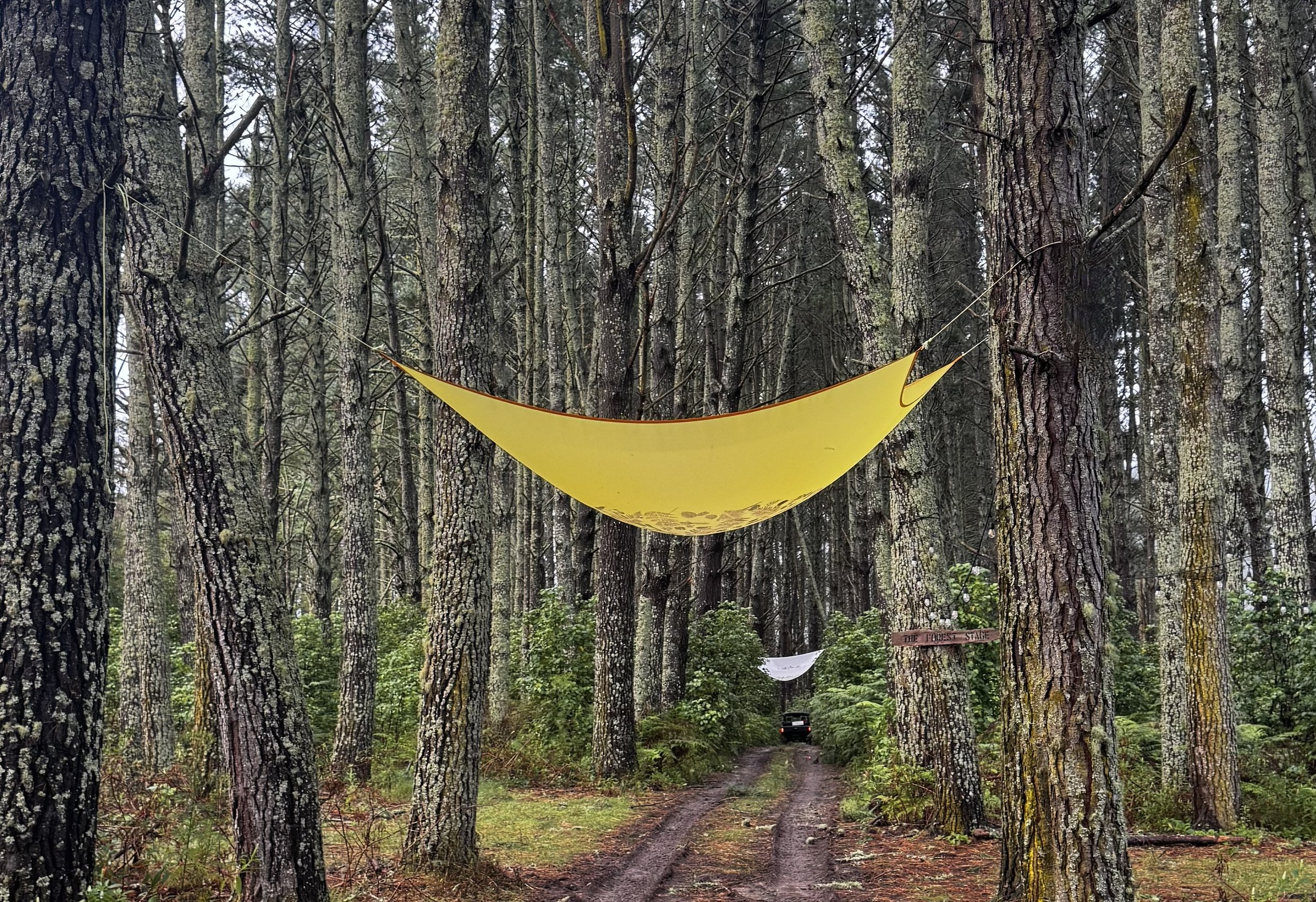 Exploring the idea of thin places, this installation occupies a threshold between the physical and the intangible. A horizontal plane of fine white silk, printed with foliage from New Zealand’s native mid-story trees, is suspended above a well-travelled path, held between forest floor and canopy. The printed forms allude to the local ecological history, while the silk’s fluid response to wind resists any sense of permanence or fixity.