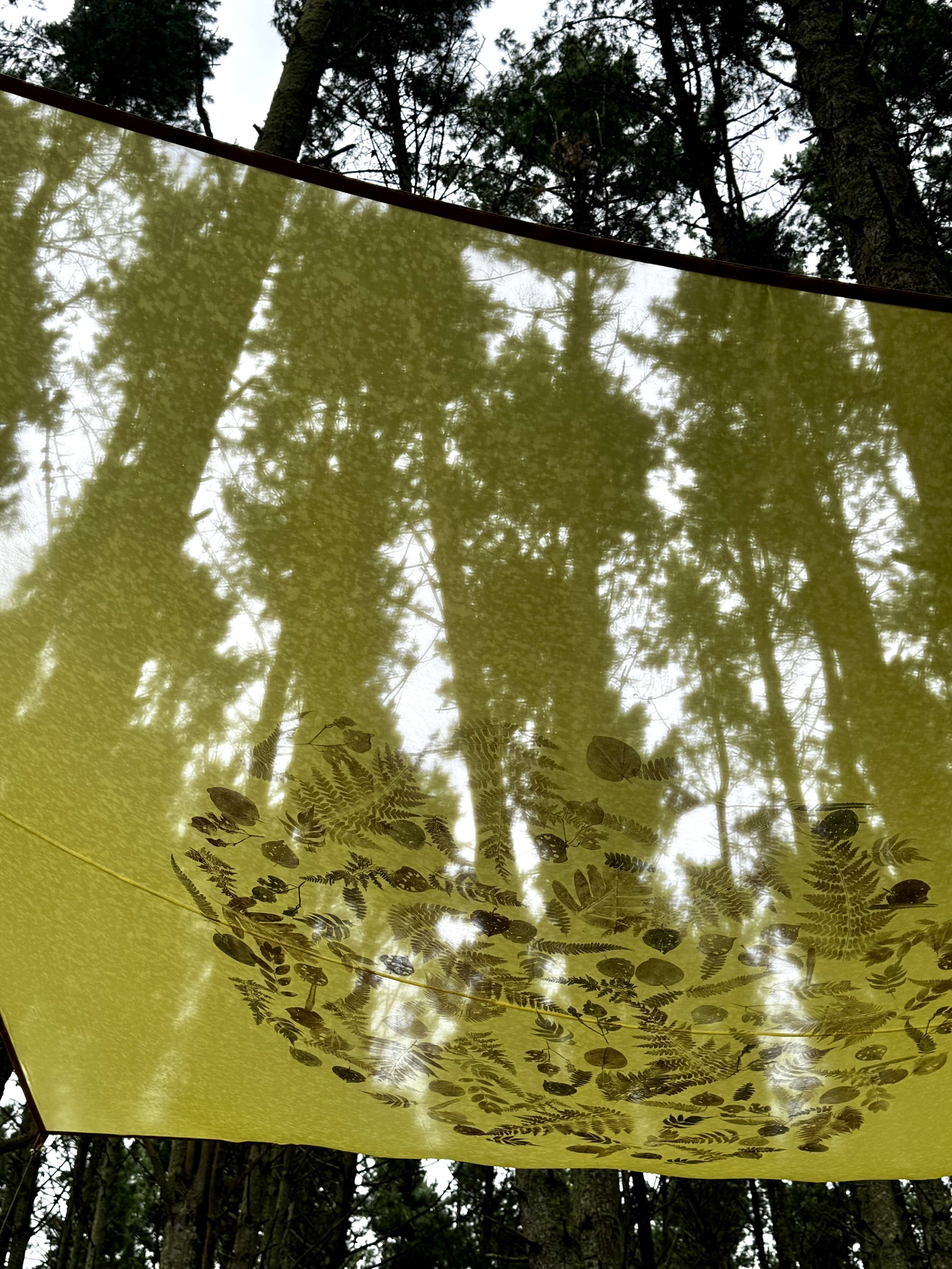 Printed with the delicate forms of foliage gathered from the New Zealand forest understory, this broad plane of citrus-yellow silk is suspended horizontally above a well-travelled path. Responsive to the slightest movement of air, the fabric becomes a register for the unseen, revealing the presence of wind as it passes gently across the imprinted leaves and fronds.